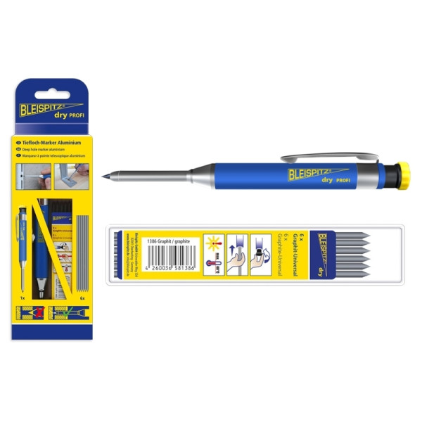 A BLEISPITZ dry mélyfurat jelölő készlet egy professzionális jelölőeszköz, amelyet kifejezetten fúrási, szerelési és építőipari munkákhoz terveztek. A készlet tartalmaz egy töltőceruzát és 6 db univerzális grafitbetétet, amelyek egyaránt használhatók durva és sima felületeken. A 45 mm-es nemesacél teleszkópos hegy lehetővé teszi a mélyfuratok és nehezen hozzáférhető helyek pontos jelölését. A 2,8 mm-es vékony hegy precíz vonalvezetést biztosít, míg a nyomógombba integrált hegyező gondoskodik arról, hogy a ceruza mindig használatra kész legyen. A teljesen fémből készült test, hegy és csíptető garantálja a tartósságot és robusztus kialakítást.