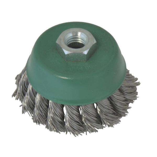 • Erős, sodrott, rozsdamentes acél szálú, menetes ultra fazékkefe sarokcsiszoló gépekhez