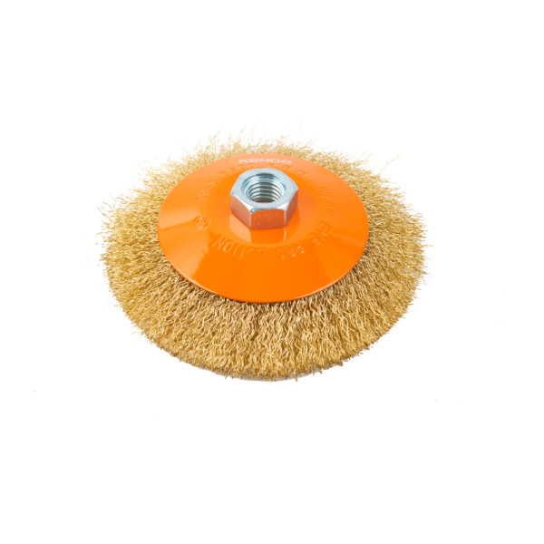 A KENDO menetes rekord kúpkefe 125 mm × M14 (No.46001729) egy erős kúpos kialakítású felületmegmunkáló eszköz, amelyet élek tisztítására és nehezen hozzáférhető helyekhez terveztek. A Ø125 mm-es fej és az M14 × 2 mm-es menet kompatibilis sarokcsiszolókkal, így gyorsan és stabilan rögzíthető. A rézbevonatú, hullámos acél drótszálak hosszú élettartamot és hatékony tisztítást biztosítanak. Ideális rozsda, festék, lakk eltávolítására, valamint sorjázási és felület-előkészítési munkákhoz.