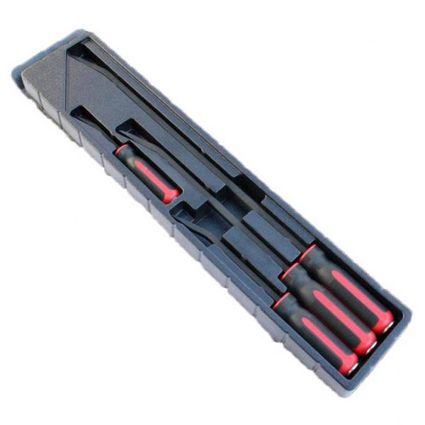 Gépjárműtechnikában használható feszítő készlet különbőző méreteket tartalmazó lapított görbített szerszámvéggel, műanyag kétkomponensű üthető fémvégű nyéllel. Készlet tartalma 200, 300, 460, 610 mm hosszú CrMo anyagösszetételű szerszám.