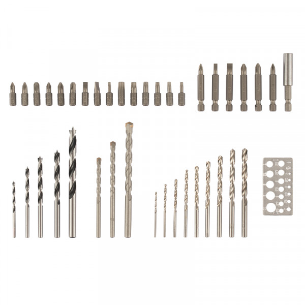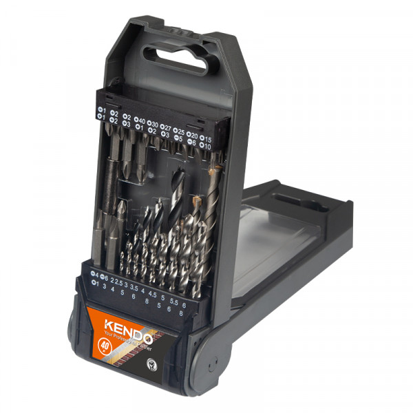 • 40 részes vegyes fúró és bit készlet, fém-, fa- és kőzet fúrófejek, csavarhúzófejek, bittartó, átmérő kiválasztó sablon a szokásos méretekhez a gyors, gépbe való beillesztéshez