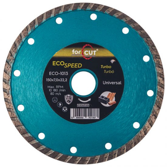 A For Cut ECO-1013 típusú,folyamatos "turbo" vágóéllel rendelkező gyémánt vágókorong. Csempék, padlólapok és egyéb kerámia anyagok, általános építőanyagok vágására használható és standard sarokcsiszolókon alkalmazható.