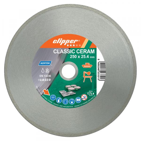 A Norton Clipper CLASSIC CERAM egy gazdaságos, folyamatos szinterezett élű gyémáttárcsa vizes vagy száraz vágáshoz. Használható közepesen kemény burkolólapokhoz, csempékhez.