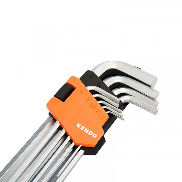 • Króm-vanádium acélból készült, 9 részes KENDO hosszú gömbvégű imbuszkulcs készlet
