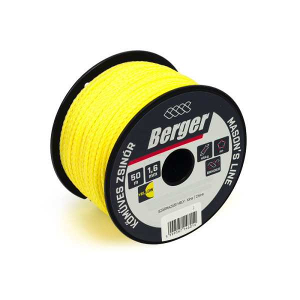 BERGER fonott kőműves zsinór PP 1,6 mm / 50 m – UV-álló, nyújtásmentes, fluoreszkáló sárga szín