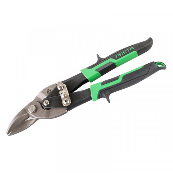 FESTA lemezvágó olló erős, edzett vágóéllel. A pofák kiváló minőségű Cr-Mo (króm-molibdén) acélból készültek a megfelelő keménység és a maximális tartósság érdekében. Vágást könnyítő csuklós áttétel a vágási erőfeszítés minimalizálása és a munka megkönnyítése érdekében. Ergonomikus, gumírozott fogantyúk a csúszásmentes és kényelmes fogásért.