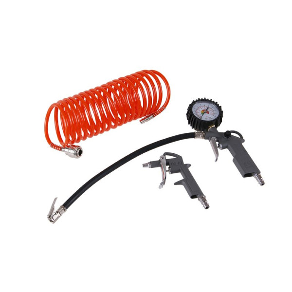 A kompresszor készlet tartalmaz egy kerékfújtató pisztolyt nyomásmérővel, egy lefúvató pisztolyt és egy 5 m-es spiráltömlőt - pneumatikus szerszámok kompresszorhoz történő csatlakoztatásához.