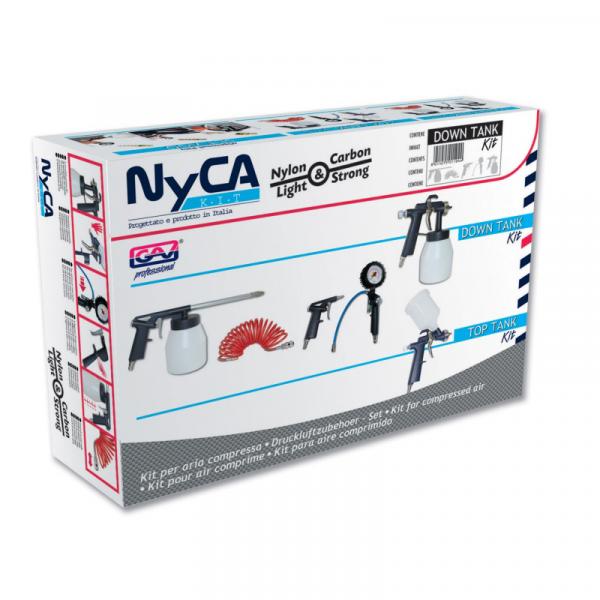 KÉSZLET TARTALMA • GAV festékszóró pisztoly felsőtartályos: NYCA VS • GAV lefuvató pisztoly 25mm: NYCA S • GAV kerékfuvató pisztoly 0-12bar 40cm: NYCA G • GAV olajszóró pisztoly 700ml: NYCA L • GAV spiráltömlő: 5m