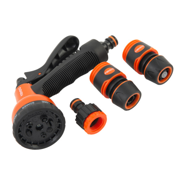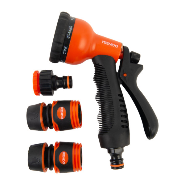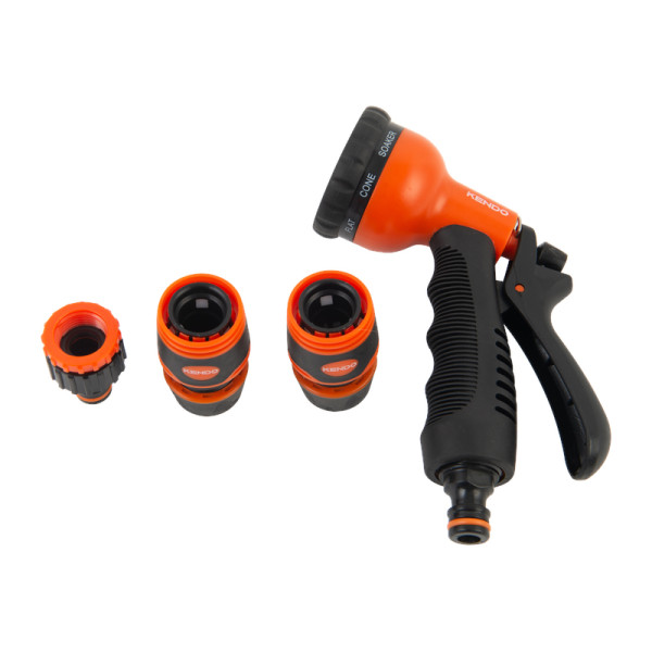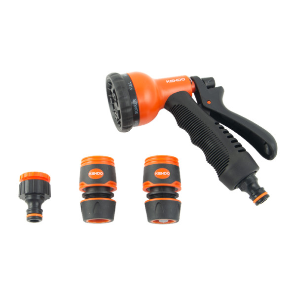 KENDO 8 funkciós locsolópisztoly és csatlakozó készlet – 4 részes prémium szett TPR-SOFT markolattal