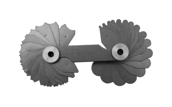 Mérőeszköz külső és belső rádiuszok mérésére, mindkét oldalon 17-17 mérőlemezzel.