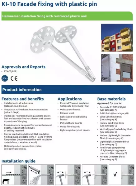 A műanyag csappal ellátott szigetelésrögzítő dübel kiválóan alkalmas kemény és félkemény szigetelőanyagok (pl. polisztirol, poliuretán, parafa) mechanikus rögzítésére. A 10×180 mm-es méret és a 110–130 mm-es átfogás ideális könnyűbetonhoz és üreges téglához. A 60 mm tányérátmérő biztosítja a megfelelő felületi nyomást, és elősegíti a vakolatréteg tökéletes tapadását. A dübel polietilén alapanyagból készül, UV-sugarak elleni védőadalékkal ellátva. A termék Lengyelországban gyártott, és rendelkezik CE minősítéssel.