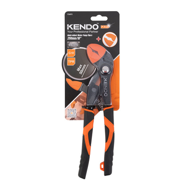 KENDO nyomógombos vízpumpa fogó 250 mm / 2" – CrV acél, TPR markolat, levehető pofavédelem